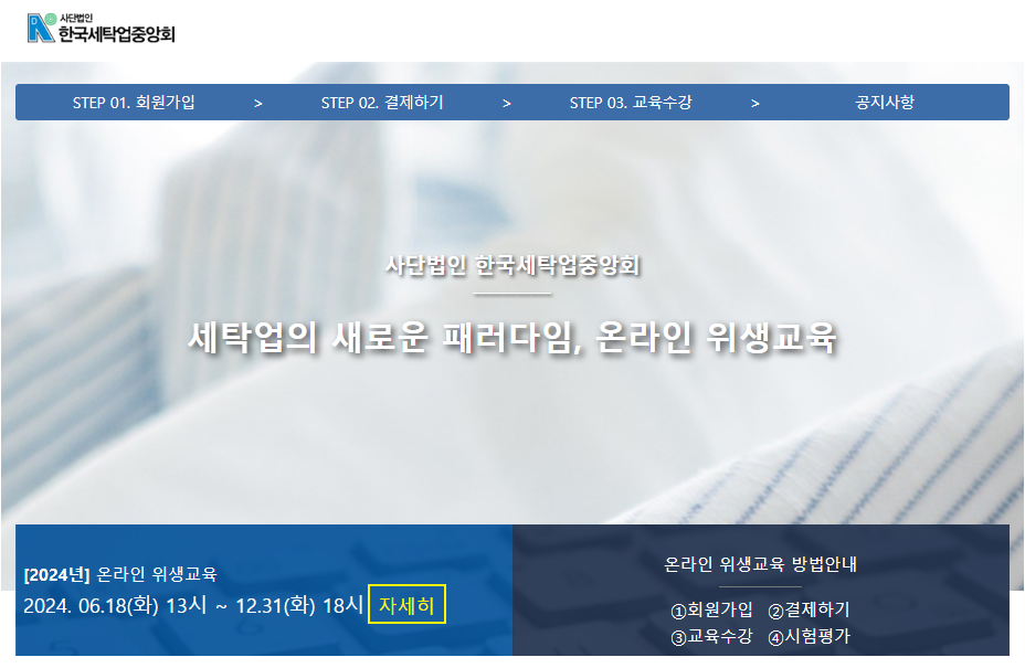 한국세탁업중앙회 사이버 세탁소 위생교육은 세탁소를 운영하거나 관련 업종 종사자들이 의무적으로 받아야 하는 위생교육을 제공합니다. 오늘은 홈페이지 바로가기 및 이용방법 알아보겠습니다. 아래 클릭시 홈페이지에 바로 접속됩니다.한국세탁업중앙회 사이버 세탁소 위생교육 바로가기    ✅ 홈페이지바로가기 👉   1. 사이버 세탁소 위생교육이란?사이버 세탁소 위생교육은 세탁업 종사자들이 위생 기준을 준수하고 안전한 세탁 환경을 유지할 수 있도록 돕기 위해 마련된 온라인 교육 프로그램입니다. 한국세탁업중앙회가 주관하며, 세탁업 종사자가 기본적으로 알아야 할 위생 관리 지침을 학습할 수 있습니다. 2. 교육 신청 방법사이버 세탁소 위생교육은 간단한 절차를 통해 신청할 수 있습니다. 다음은 신청 과정을 단계별로 정리한 ..