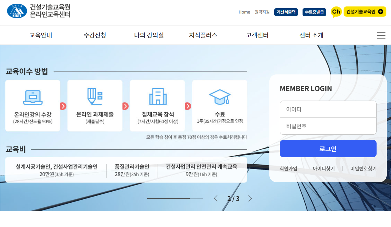건설기술교육원 온라인 교육센터는 건설 관련 기술자와 관리자가 반드시 받아야 하는 의무교육을 제공하는 사이트입니다. 오늘은 홈페이지 바로가기 및 이용방법 알아보겠습니다. 아래 클릭시 홈페이지에 바로 접속됩니다. 건설기술교육원 온라인 교육센터 바로가기    ✅ 홈페이지바로가기 👉   건설기술교육 온라인 교육센터란? 건설기술교육 온라인 교육센터는 건설 관련 기술자, 관리자, 공무원 등을 대상으로 한 온라인 학습 플랫폼입니다. 이 센터는 다양한 건설 기술 교육 과정을 제공하여 학습자가 언제 어디서나 전문 지식을 습득할 수 있도록 돕습니다. 이 플랫폼은 최신 기술 동향과  교육 과정을 포함하고 있어, 건설 산업의 변화에 발맞춰 학습할 수 있는 환경을 제공합니다. 주요 제공 과정 1. 건설기술 전문 교육건설 기초..