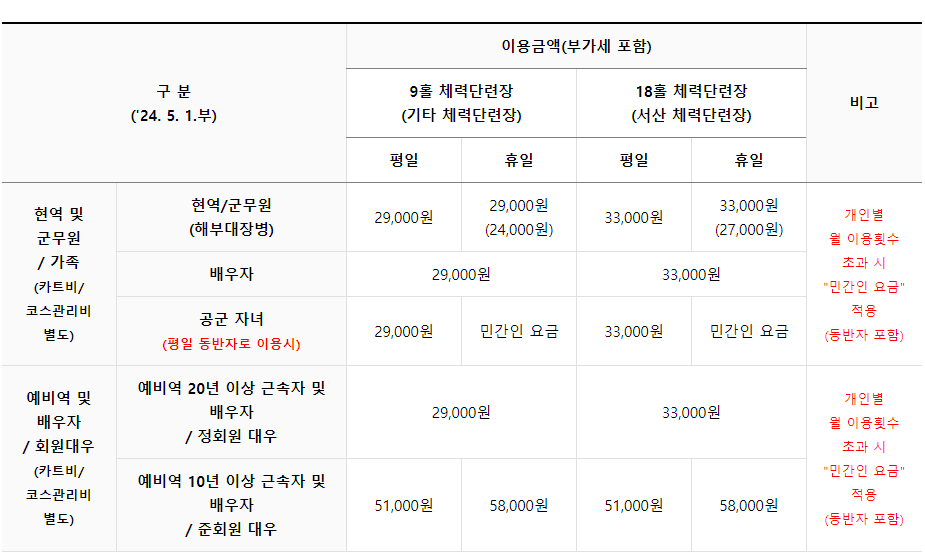 공군체력단련장은 군인과 그 가족들뿐만 아니라 일정 조건을 충족하는 일반인도 이용할 수 있어요. 요금은 이용 대상과 이용하는 시간에 따라 다르니, 자신에게 맞는 요금을 확인해 보세요.