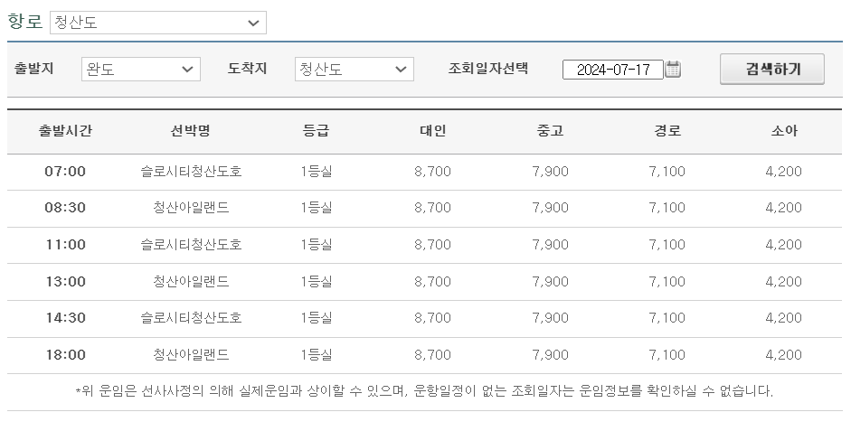 완도에서 청산도행 배편 요금은 대인 8,700원, 중고등학생 7,900원, 경로 7,100원, 소아 4,200원입니다.