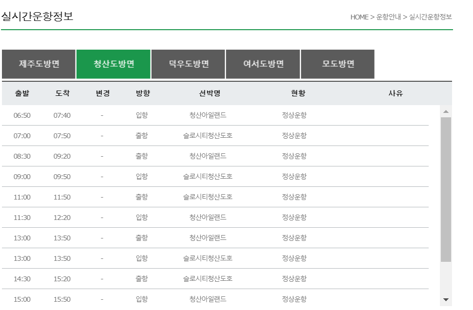 운항관련해서는 선사인 청산농협에 문의하시면 되는데요. 전화번호는 051-552-9385번입니다. 실시간 운항정보 역시 여객터미널 홈페이지에서 확인가능한데요. 오전 6시 50분부터 배편이 운항되고 있는것을 확인가능합니다. 운항 소요시간은 약 50분입니다.