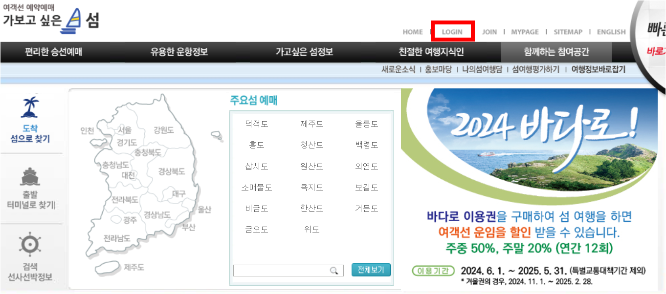 1. 가보고 싶은 섬 홈페이지에 접속하신 후 상단의 로그인 버튼을 클릭하세요.