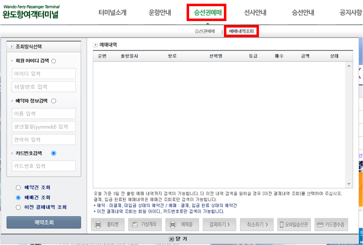 9. 예매하신 내용은 승선권예매 > 예매내역조회를 선택하시면 확인가능합니다.