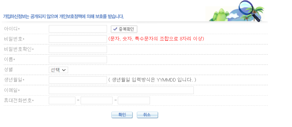 5. 아이디, 비밀번호, 이름, 성별, 휴대전화번호등을 모두 입력하신 후 확인 버튼을 클릭하여 가입을 완료하세요.