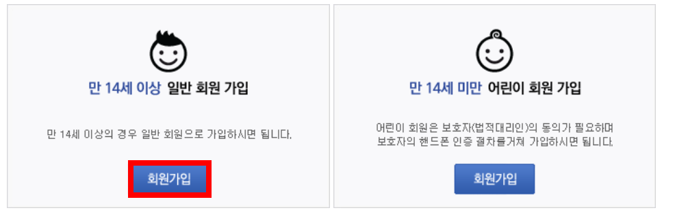 3. 만 14세이상 일반회원가입 버튼을 클릭하세요.