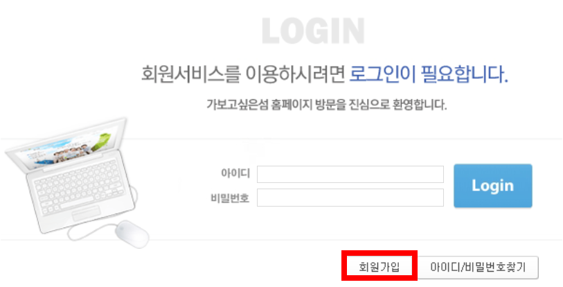 7. 가보고싶은섬 홈페이지에서 가입한 아이디와 비밀번호를 입력하신 후 로그인해주세요.