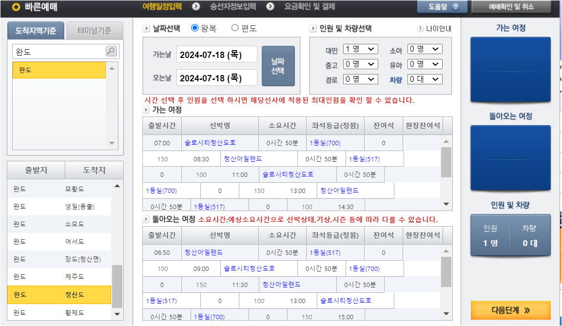8. 출발지를 완도로 선택하시고 도착지를 청산도로 선택하신 후 날짜와 인원, 차량을 선택하신 원하는 시간대를 선택하세요. 다음단계를 클릭 후 결제를 완료하시면 예약이 완료됩니다.