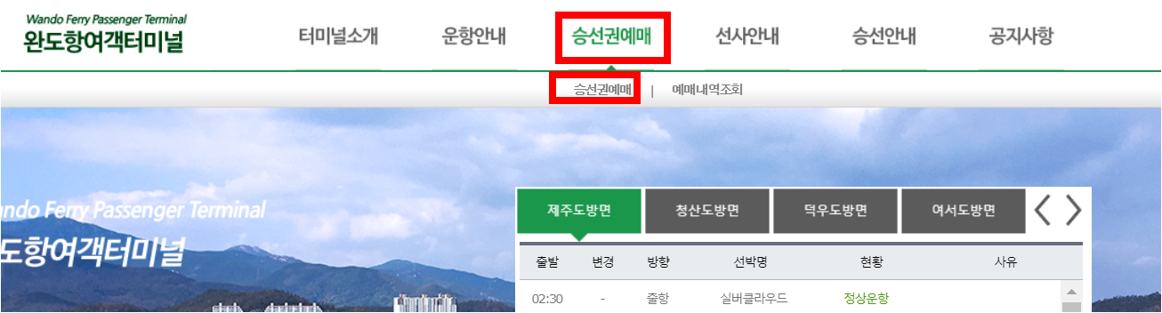 6. 다시 완도여객선터미널로 돌아가셔서 메인화면의 승선권예매를 선택하세요.