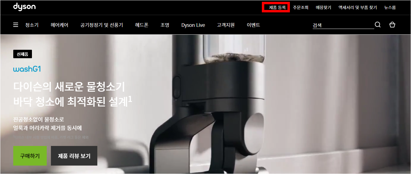 6. 로그인 후 다이슨 공식 홈페이지 상단 메뉴에서 제품등록을 클릭하여 정품등록 페이지로 이동합니다.