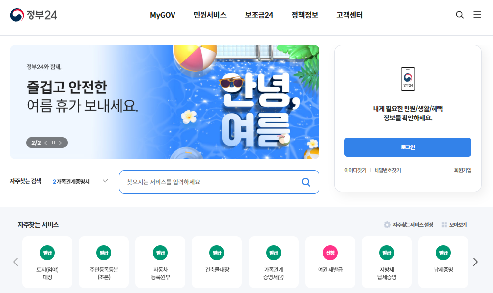 병적기록표는 정부의 민원 서비스인 민원24(현재는 정부24로 통합됨)를 통해 발급받을 수 있습니다. 아래 링크를 클릭하여 정부24 홈페이지에 접속합니다.