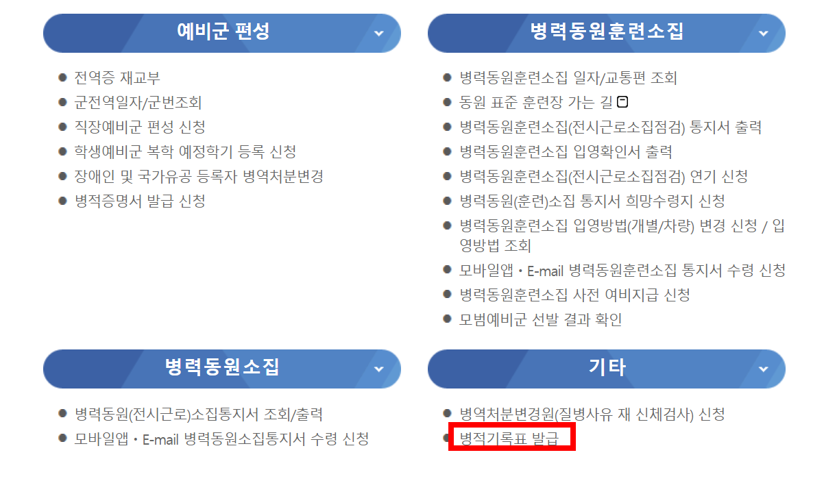다음화면에서 기타 > 병적기록표 발급을 선택하세요.