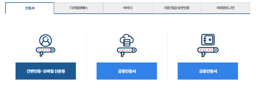 - 로그인: 간편인증, 모바일신분증, 공동인증서, 금융인증서 등을 통해 로그인 가능합니다.