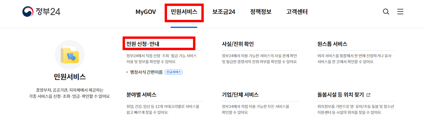 로그인 후 정부24 홈페이지 상단 메뉴에서 "민원안내/신청"을 클릭하세요.