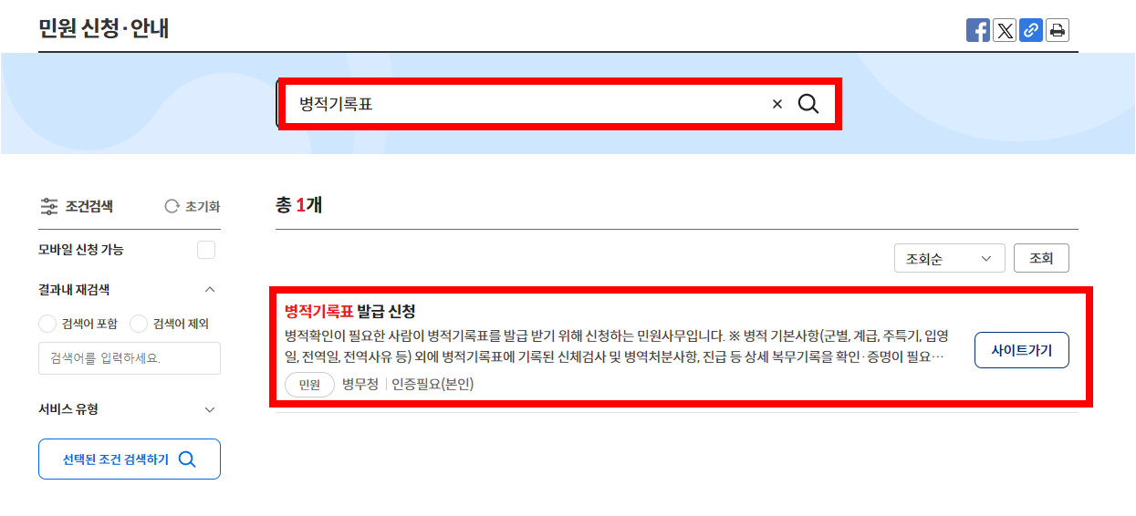 검색창에 "병적기록표"를 입력하여 검색합니다. 검색 결과에서 "병적기록표 발급" 항목을 선택하여 발급 페이지로 이동합니다.