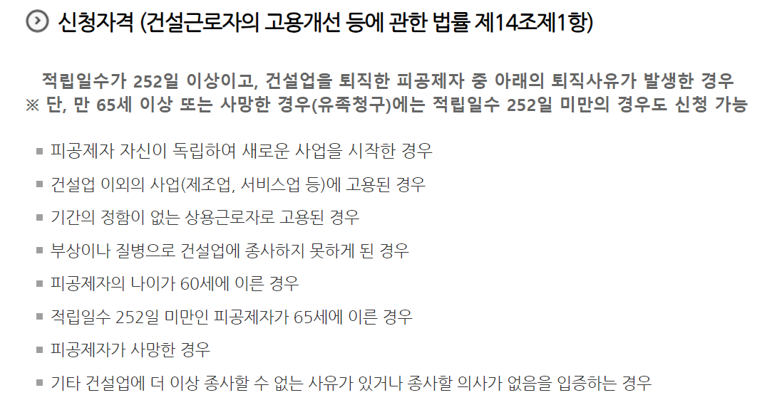 퇴직공제를 신청하려면 자격이 별도로 주어집니다 기본적인 공제금의 적립일수를 충족해야 신청할 수 있어요. 적립일수는 252일이고 회사에 가입한 기간이 아니라 근로한 일수를 기준으로 합니다 그러나 56세 이상이거나 사망한 경우에는 기본 적립일수를 충족하지 않아도 돼요.