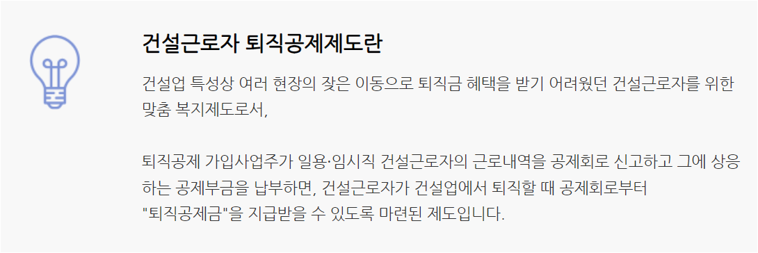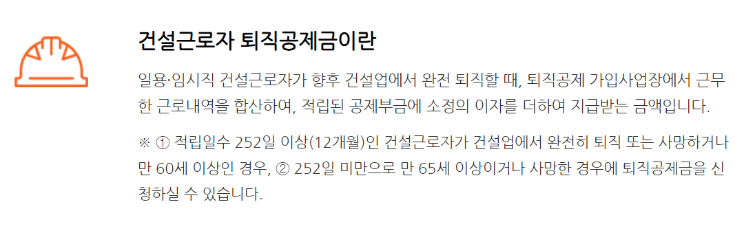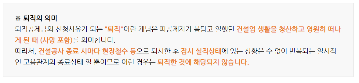 건설 현장을 자주 이동하는 사람들이 있기 때문에 근로일수에 맞는 퇴직공제금을 나중에 퇴직할 때 지급받을 수 있어요 이때 말하는 퇴직은 완전한 퇴직을 이야기하는 거예요.